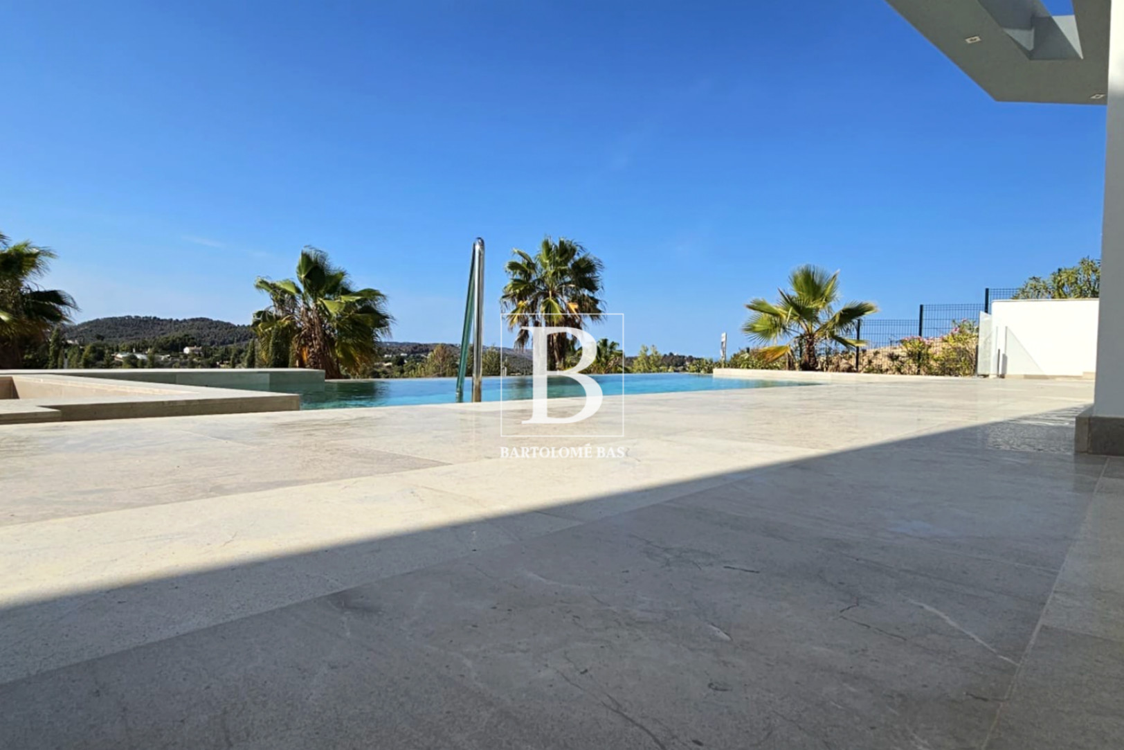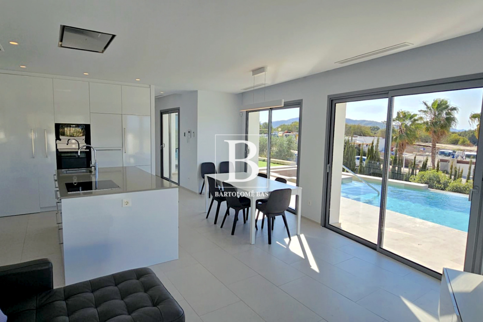 Inside, light takes centre stage. Large windows erase the boundary between indoors and outdoors, allowing the living and dining areas to flow seamlessly onto the terraces and the infinity pool. The kitchen, elegant and functional, becomes a true gathering place, oriented towards the exterior and designed for sharing special moments. Every space invites you to slow down, to enjoy, and to entertain effortlessly.