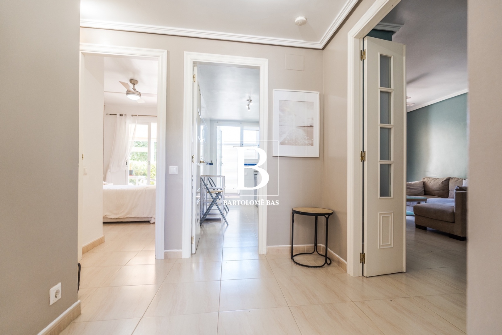 Se compone de un hall de entrada, un salóncomedor luminoso que da acceso a una terraza prolongada por el jardín, una cocina independiente con una amplia lavandería adjunta. Dos dormitorios dobles tienen salida a la terraza, y el apartamento dispone de dos baños con ducha, uno de ellos en suite.