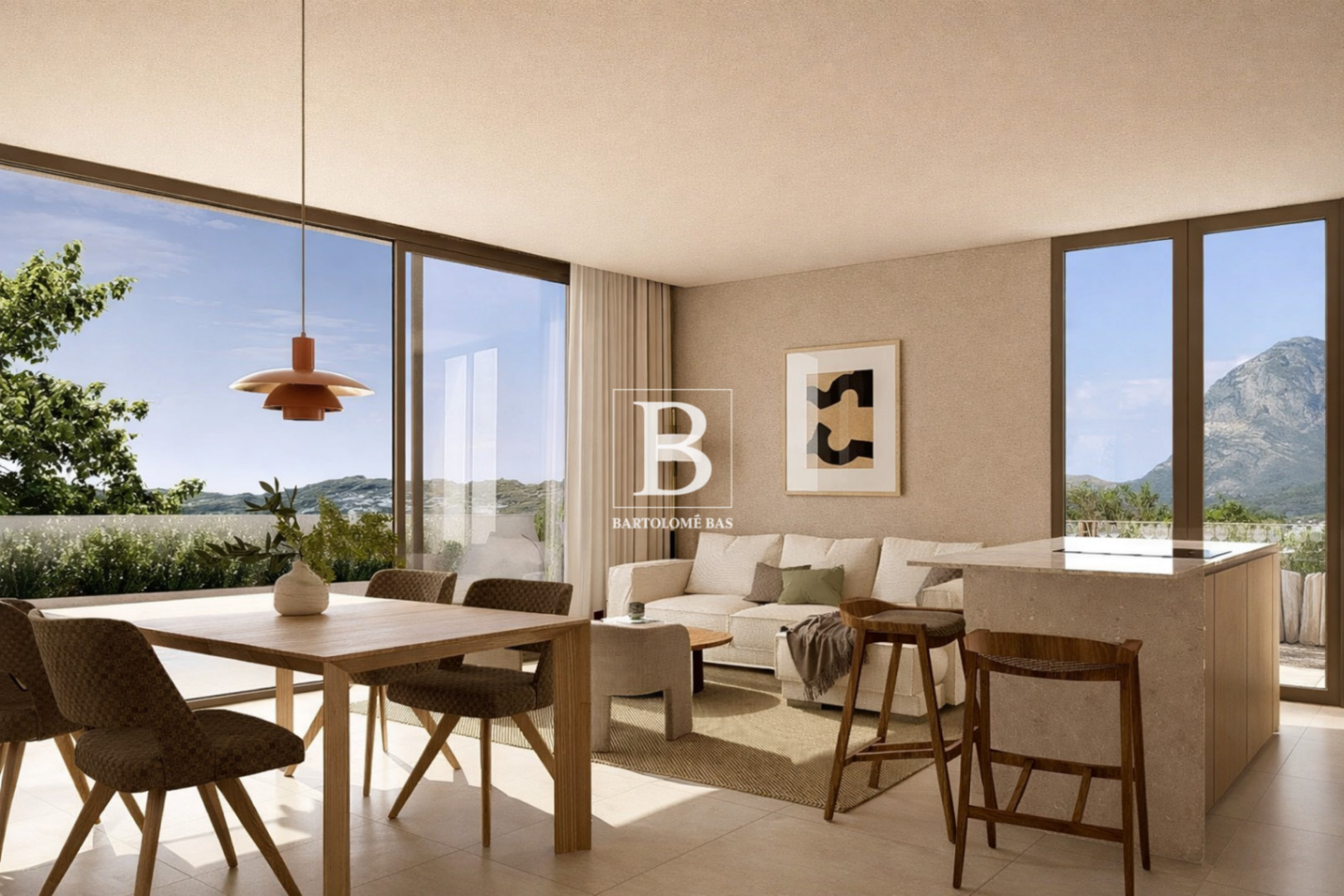 La vivienda cuenta con una superficie interior confortable, organizada en torno a un salóncomedor con cocina abierta, concebido como un espacio funcional y acogedor. Los grandes ventanales permiten una conexión directa con el exterior, aportando luminosidad y sensación de amplitud.