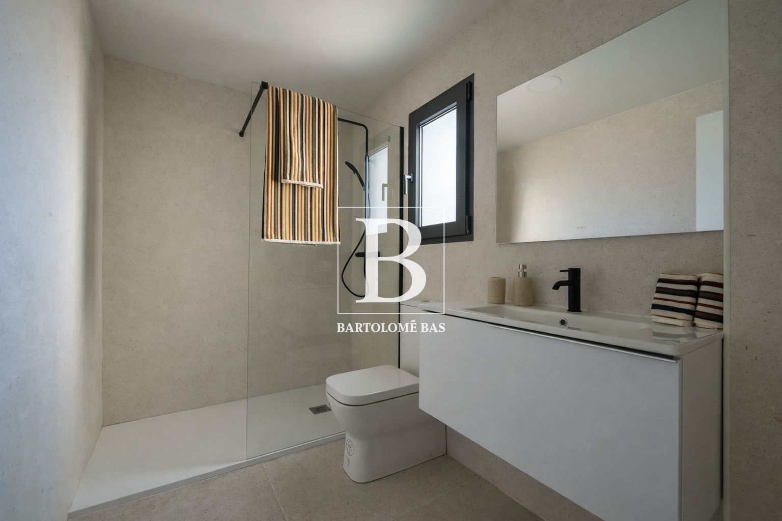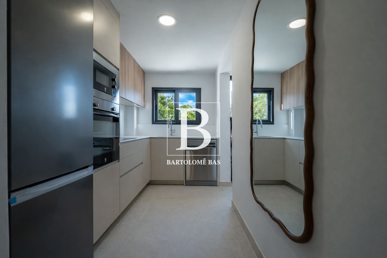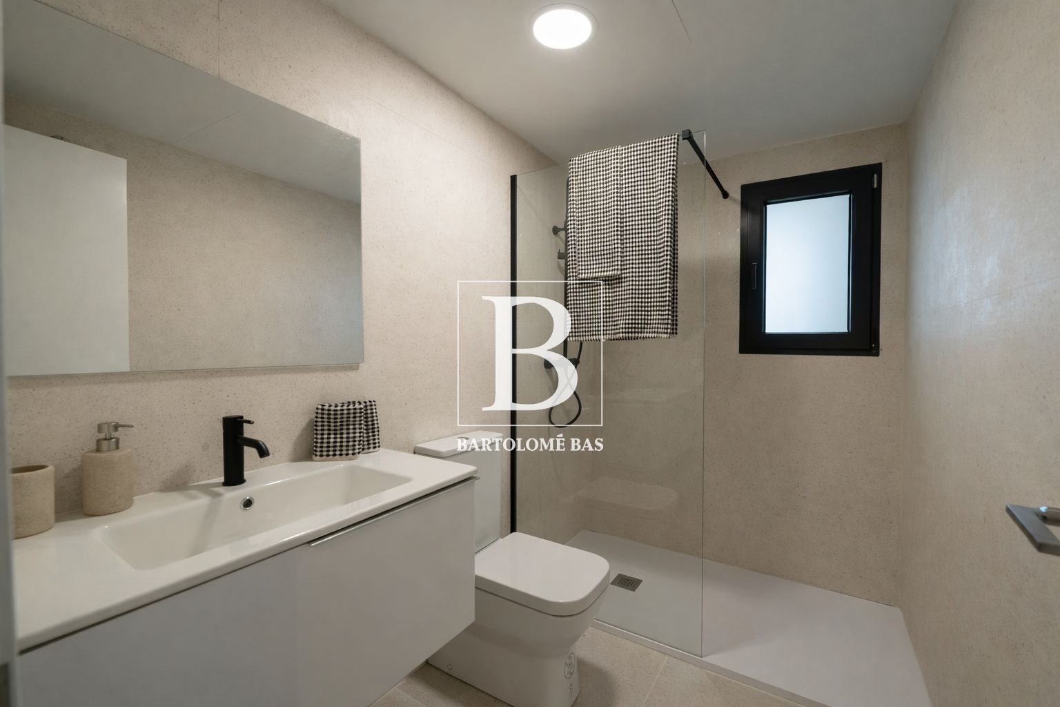 La cocina se entrega completamente equipada, con mobiliario de líneas actuales y electrodomésticos integrados, pensada para un uso práctico y funcional. Los baños presentan un diseño sobrio y moderno, con muebles suspendidos, platos de ducha extraplanos, mamparas de cristal y grifería en acabado negro mate.
