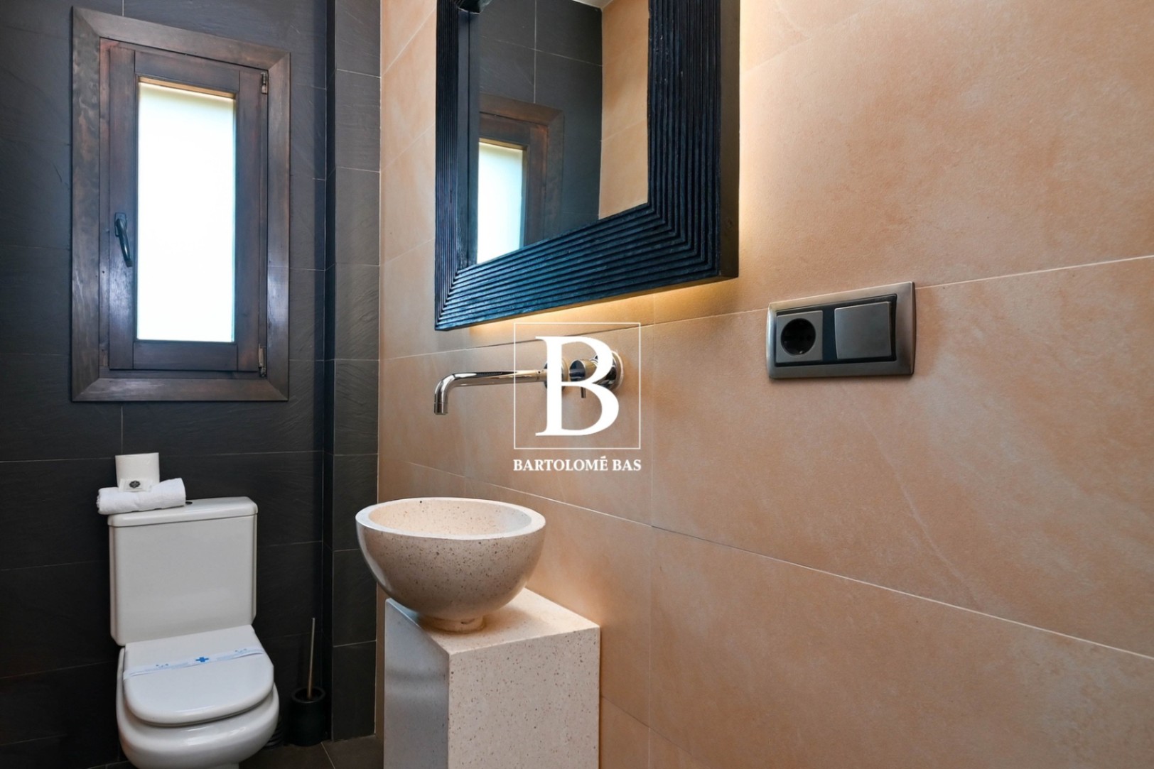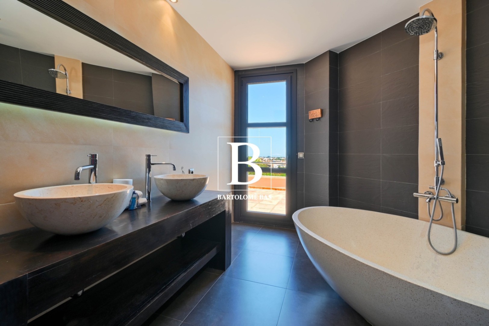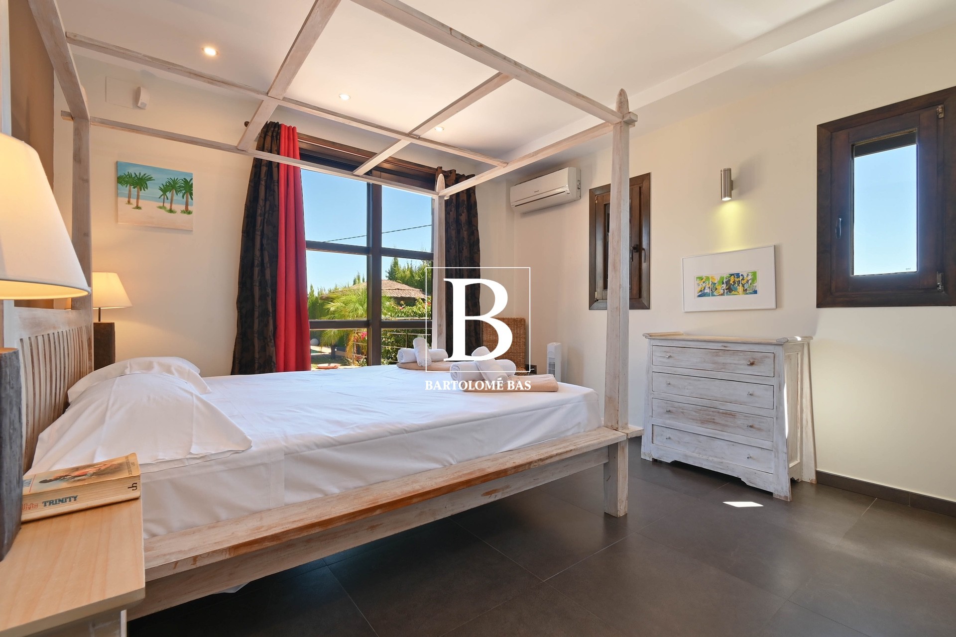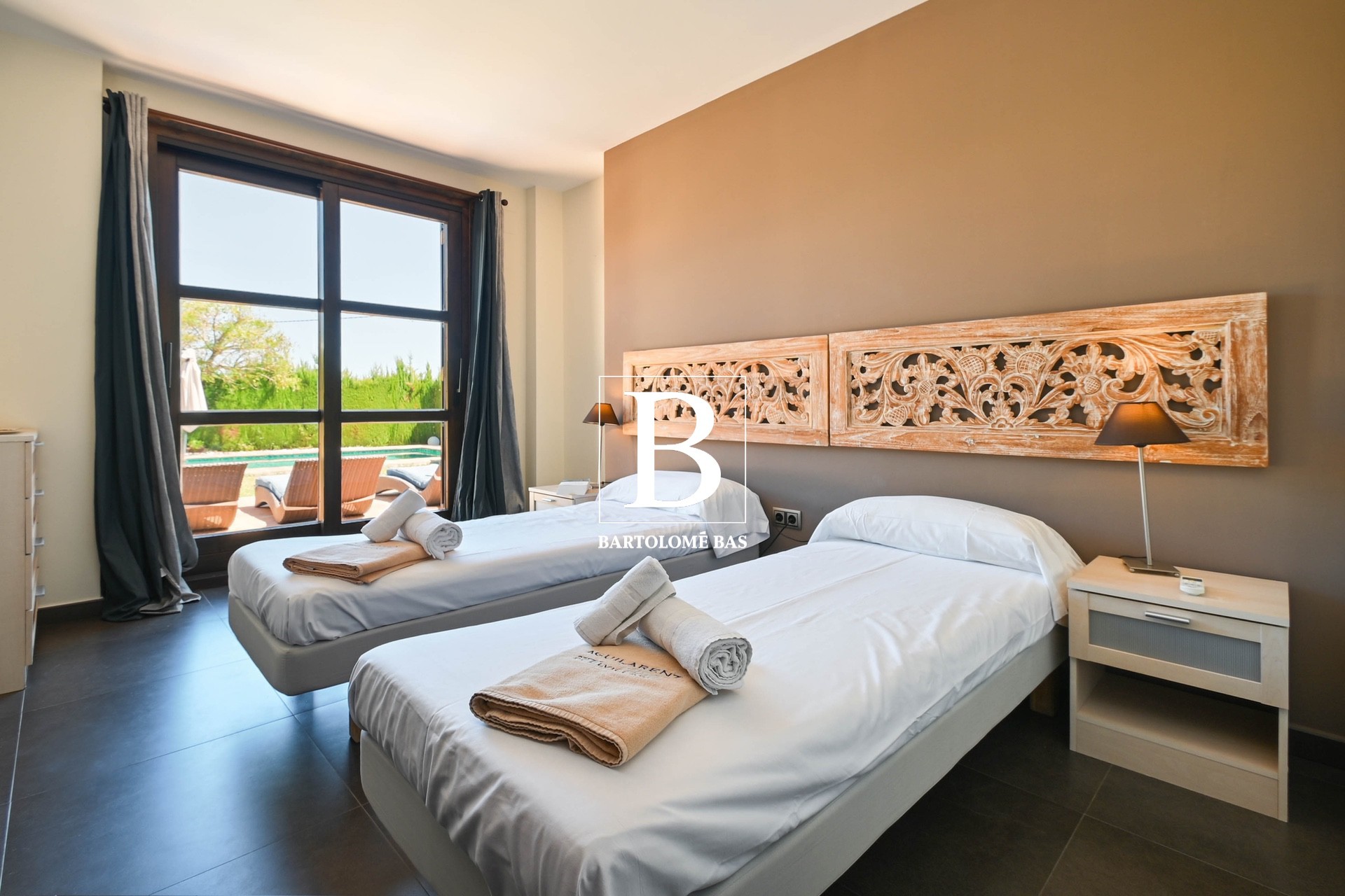 La propiedad está distribuida en tres plantas, la villa consta en el nivel principal de una amplia terraza cubierta en forma de L con salón y comedor de verano, un espacio interior diáfano que consta de salón con chimenea, comedor y cocina americana. Tiene tres habitaciones dobles de tamaño muy generoso, así como dos cuartos de baños.